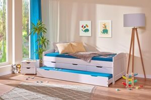 Das Inter Link Funktionsbett Ulli ist die ideale Lösung für Räume mit begrenztem Platzangebot. Mit einem Handgriff verwandelt sich dieses vielseitige Einzelbett in einen Rückzugsort für mehrere Personen. Gefertigt aus hochwertigem Kiefer-Massivholz und in elegantem Weiß lackiert, fügt sich das Bett harmonisch in jede Kinderzimmereinrichtung ein. Das Modell bietet zwei Liegeflächen von jeweils 90×200 cm und wird inklusive eines stabilen Lattenrosts geliefert.