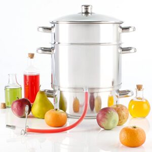 Dank seiner Kompatibilität mit allen Herdarten, inklusive Induktion, ist dieser Dampfentsafter flexibel einsetzbar. Die außen polierte und innen seidenmatte Oberfläche verleiht ihm nicht nur ein ansprechendes Design, sondern erleichtert auch die Handhabung. Die bereits im Lieferumfang enthaltenen zwei Ablaufschläuche aus hygienischem Silikon ermöglichen eine einfache Saftabfüllung.