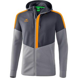 Die Erima Herren Squad Trainings Jacke in der Farbkombination Slate Grey/Monument Grey/New Orange ist eine ideale Wahl für sportliche Aktivitäten und Freizeit. Sie verfügt über einen hohen Kragen mit einer praktischen Kapuze, die durch einen Kordelzug individuell angepasst werden kann. Dies sorgt für zusätzlichen Schutz gegen Wind und Wetter.