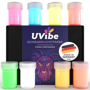 Entdecke die UVIBE Fluoreszierende Schwarzlicht Farbe – die perfekte Wahl für alle, die ihren Wänden, Kunstwerken und Deko-Elementen einen einzigartigen Farbkick verleihen möchten. Diese 8 knalligen Neonfarben machen Deine Projekte sowohl tagsüber als auch unter UV-Licht zu einem echten Hingucker.