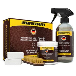 Entdecke das Macari Lederpflege Komplettset, bestehend aus 500 ml Lederreiniger, 500 ml Lederbalsam, einer hochwertigen Bürste und zwei Schwämmen. Dieses Set eignet sich perfekt für die Pflege deiner Ledermöbel, -kleidung, -schuhe und mehr. Die enthaltene Anleitung sorgt dafür, dass du die Produkte optimal nutzen kannst.