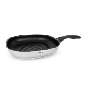 Die KLAMER Grillpfanne Induktion 28cm ist der ideale Begleiter für alle Grill- und Kochliebhaber. Mit ihren markanten Rillen ermöglicht sie eine fettarme Zubereitung von Fleisch, Gemüse und mehr. Der breite Schüttrand sorgt dafür, dass Flüssigkeiten beim Abgießen nicht tropfen, was die Handhabung erheblich erleichtert.