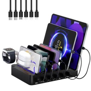 Die ordentliche und organisierte Ladestation sorgt dafür, dass Sie nie wieder eine Vielzahl von Ladegeräten an Ihrer Steckdose benötigen. Alle Geräte können an einem Ort aufgeladen werden, was Ihren Schreibtisch aufgeräumt hält. Im Lieferumfang sind sechs praktische Datenkabel enthalten: drei Apple Lightning-Kabel, zwei Typ-C-Kabel und ein Micro-USB-Kabel, ideal für jeden Raum.