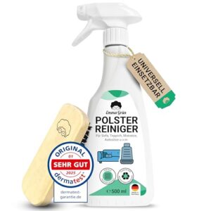 Entdecken Sie den Emma Grün® Polsterreiniger, ideal für die gründliche Reinigung von Sofa, Couch und Autositzen. Mit einer kraftvollen Formel und einer hochwertigen Polsterbürste entfernt dieser Reiniger selbst tiefsitzende Verschmutzungen wie Fett-, Kaffee- und Rotweinflecken mühelos. Er ist multifunktional einsetzbar und eignet sich nicht nur als Teppichreinigungsmittel, sondern auch als Autositzreiniger und Textilreiniger für alle typischen Textiloberflächen in Ihrem Haushalt.