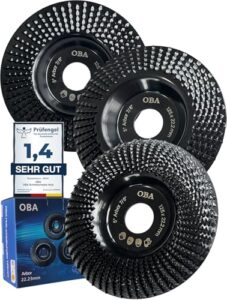 Die OBA Holz Schleifscheibe für Winkelschleifer mit einem Durchmesser von 125 mm und einer Aufnahme von 22,2 mm ist das ideale Werkzeug für alle Holzarbeiten. Sie ist mit den gängigen Winkelschleifern kompatibel, sodass Sie keine zusätzlichen Adapter benötigen. Im Lieferumfang sind drei verschiedene Klingen enthalten: eine gebogene Holzschnitzklinge, eine Flachschleifprofilklinge und eine abgeschrägte Holzschnitzklinge, die vielseitige Anwendungen ermöglichen.