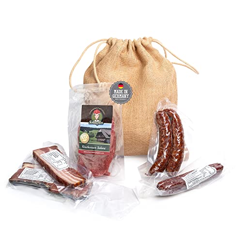 Entdecke unser kleines Feinkost Probierpaket im Jutesäckchen, das eine exquisite Auswahl an Wurst- und Fleischspezialitäten aus dem Schwarzwald bietet. In diesem Set erhältst du fünf verschiedene Wurstsorten, darunter eine Vesperscheibe Schwarzwälder Schinken (100g), eine Vesperscheibe Bauchspeck (100g), ein Paar Bauernwürste, ein Paar Landjäger und unsere köstliche Schwarzwälder Kirschwassersalami (200g) in Scheiben geschnitten.