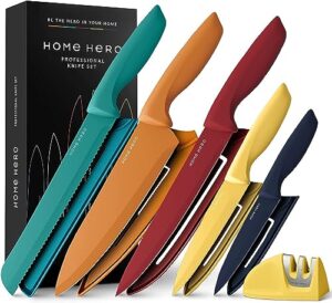 Entdecken Sie das Home Hero Küchenmesser-Set, ein professionelles Messerset, das in jeder Küche unverzichtbar ist. Dieses farbenfrohe Küchenmesserset besteht aus 11 hochwertigen Teilen, darunter ein 20 cm langes Schälmesser, ein 33 cm langes Brotmesser, ein 33 cm langes Kochmesser, ein 33 cm langes Tranchiermesser und ein 23 cm langes Universalmesser. Jedes Messer wird mit einer individuellen Schutzhülle geliefert, die die Klingen scharf hält, wenn sie nicht in Gebrauch sind.