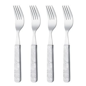 Die GRÄWE Tafelgabel, Menügabel im praktischen 4er Set überzeugt durch ihr elegantes Perlmutt-Design und ist eine stilvolle Ergänzung für Ihre Tischkultur. Jede Gabel verfügt über Griffschalen, die in einer ansprechenden Perlmuttoptik gehalten sind. Durch die 3-fache Vernietung mit durchgehenden Edelstahlnieten ist eine hohe Stabilität gewährleistet, sodass Sie sich auf eine langlebige Nutzung verlassen können. Im Gegensatz zu herkömmlichen Gabeln sind hier keine Alunieten oder Blenden verarbeitet, was die Qualität zusätzlich erhöht.