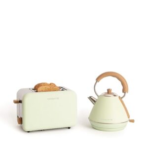 Entdecken Sie das CREATE/PACK TOAST RETRO + KETTLE RETRO M Set in Pastellgrün, das sowohl Funktionalität als auch Stil in Ihre Küche bringt. Der KETTLE RETRO M Wasserkocher erhitzt bis zu 1 Liter Wasser in nur 2 Minuten. Dank seines integrierten Sicherheitssystems schaltet er sich automatisch ab, wenn kein Wasser mehr vorhanden ist. Hergestellt aus BPA- und anderen giftfreien Materialien, ist er eine sichere Wahl für Ihren Haushalt.