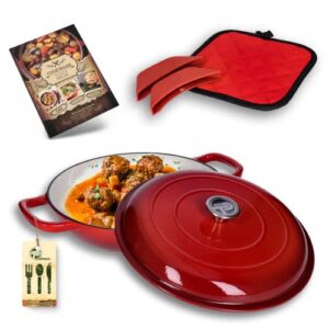 Entdecken Sie die vielseitige Servier-Pfanne aus emailliertem Gusseisen mit einem Durchmesser von 31 cm und einem Volumen von 3,7 Litern. Diese Pfanne ist für alle Herdarten, einschließlich Induktion, geeignet und backofenfest bis 260°C. Der robuste Edelstahlgriff ermöglicht eine sichere Handhabung, während die emaillierte Oberfläche sofort einsatzbereit ist, ohne dass ein Einbrennen erforderlich ist.
