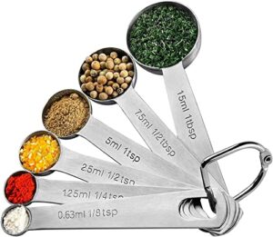 Dieses Set enthält verschiedene Messgrößen: 1 Tbsp, 1 tsp, 3/4 tsp, 1/2 tsp, 1/4 tsp und 1/8 tsp. Die Löffel sind so gestaltet, dass sie problemlos in Gewürzgläser passen und sowohl für trockene als auch flüssige Zutaten geeignet sind. Dank der gut lesbaren, eingravierten Markierungen behalten Sie stets den Überblick über Ihre Maße.
