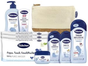 Die dermatologisch getesteten Pflegeprodukte sind pH-hautneutral und vegan, wodurch sie ideal für die zarte Haut Ihres Babys sind. Das Set umfasst ein Baby Shampoo (200ml) für eine milde Reinigung, ein Traum Bad (500ml) für entspannende Badezeiten, eine Spezial Wundschutz Creme (75ml) für den optimalen Schutz der Haut, ein Wasch Gel (400ml), eine Pflege Creme (75ml) zur intensiven Feuchtigkeitspflege, ein Baby Öl (200ml) für zusätzlichen Schutz sowie einen praktischen 3er-Pack Aqua Touch Feuchttücher und eine Kosmetiktasche.