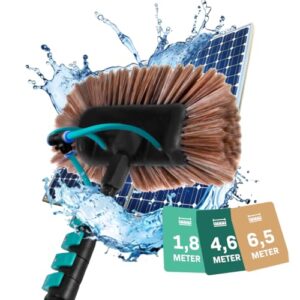 Die integrierte 9-Meter-Wasserschlauch mit regelbarem Kugelhahn ermöglicht es Ihnen, Schmutz direkt wegzuspülen und lästige Wasserflecken oder Streifen auf den Fenstern zu vermeiden. Dank der weichen, aber widerstandsfähigen Borsten entfernt die Bürste hartnäckigen Schmutz gründlich, ohne empfindliche Oberflächen wie Solarpaneele oder Lack zu beschädigen.