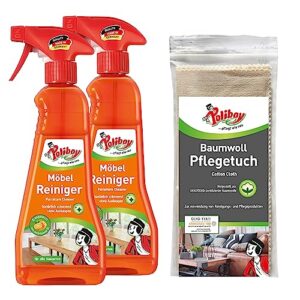 Der POLIBOY Möbel Reiniger ist ideal für die regelmäßige Anwendung und dient auch als perfekte Vorreinigung für andere Holzpflegemittel wie Balsam, Holzwachs, Holzpolitur oder Holzöl. Im Set enthalten ist ein hochwertiges Baumwoll Pflegetuch, das sich hervorragend zum Auftragen, Reinigen und Polieren eignet. Mit einer Größe von 25 x 33 cm ist es kratzarm, fusselfrei und bis zu 60 Grad waschbar.