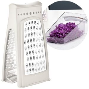 Das ergonomische Design der Reibe bietet Ihnen ein komfortables und sicheres Griffgefühl. Die rutschfesten Griffe und die stabile Basis gewährleisten, dass Sie ohne Bedenken reiben können. Dieses Küchenwerkzeug ist ideal für das Raspeln von Käse, das Zerkleinern von Gemüse oder das Herstellen von Zitronenschalen.