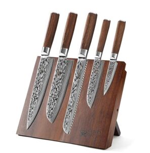 Entdecken Sie das Captain Cut 5-teiliges Edelstahl Küchenmesser Set mit Damast Optik, das Ihnen alle essenziellen Küchenmesser für präzise Schneidarbeiten bietet. Dieses vielseitige Messerset beinhaltet ein Chefmesser, Santoku-Messer, Brotmesser, ein kleines Santoku und ein Officemesser, die in einem eleganten, magnetischen Messerblock aus hochwertigem Akazienholz aufbewahrt werden. Der Block sorgt für sicheren Halt und schnellen Zugriff, während er gleichzeitig als stilvoller Hingucker in Ihrer Küche dient.