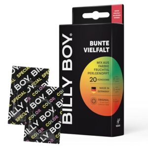 Entdecke die BILLY BOY Kondome Bunte Vielfalt in einer praktischen 20er Packung und bereichere dein Liebesleben mit abwechslungsreichen und aufregenden Erlebnissen. Dieser Kondommix bietet dir eine spannende Auswahl an genoppten und farbigen Kondomen sowie fruchtigen Aromen, die das Liebesspiel noch genussvoller machen.