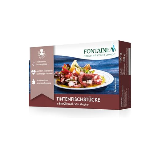 Entdecke die Fontaine Tintenfischstücke in Bio-Olivenöl – ein hochwertiges Produkt, das aus 100% zertifizierter, nachhaltiger Fischerei stammt. Jede Dose enthält 120 g zarte Tintenfischstücke, die in extra vergine Bio-Olivenöl eingelegt sind. Diese köstlichen Stücke sind ideal für mediterrane Gerichte und bringen mit einer feinen Pfeffernote das gewisse Etwas in deine Küche.