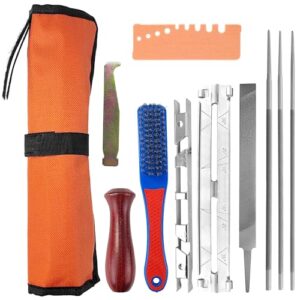 Das Set beinhaltet 3 Rundfeilen, 1 Tiefenbegrenzer, 1 Kettensägenfeilenhalter, 1 Kerbenreiniger, 1 Schnellprüfanzeige, 1 Winkelführungshalter, 1 Hartholzgriff, 1 aufgerollte Werkzeugtasche und 1 Drahtbürste, sodass Sie bestens ausgestattet sind, um Ihre Kettensäge in einem optimalen Zustand zu halten.