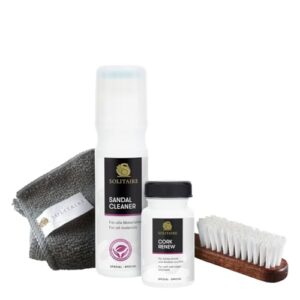 Das SOLITAIRE Kork-Sandalen Reinigungs- und Pflegeset ist die ideale Lösung für die umfassende Pflege Ihrer Sandalen, Hausschuhe und offenen Schuhe mit Korksohlen. Dieses 4-teilige Set beinhaltet alles, was Sie für eine gründliche Reinigung und Pflege benötigen: den Sandal Cleaner, Cork Renew, eine praktische Bürste und ein Mikrofasertuch.