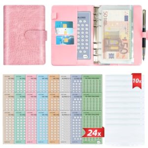 Das Set beinhaltet einen A6 Leder Binder, 10 Binder Taschen und 24 Spar Challenge Karten. Damit hast du ausreichend Material, um deine Sparreise zu beginnen, ohne dir Sorgen um leere Karten zu machen. Der strapazierfähige Binder mit einzigartigem Knopfdesign bietet Platz für Stifte, Ausweise und mehr.