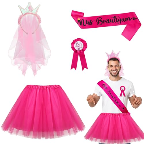 Feiere den Junggesellenabschied stilvoll mit unserem JGA Outfit Set für Männer. In diesem Set enthalten sind eine Miss Bräutigam Schärpe, ein Besten Ehemann Abzeichen, ein rosa Schleier Krone Stirnband und ein Rosa Tüllrock. Mit diesen Accessoires wirst du zum absoluten Highlight der Feier und sorgst für unvergessliche Momente, die den Bräutigam stolz machen.