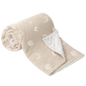 Die Bearmoss Babydecke aus 100 % Musselin-Baumwolle ist die ideale Wahl für die zarte Haut Ihres Neugeborenen. Die Vorderseite besteht aus atmungsaktivem Musselin, während die Rückseite aus ultraweichem Punktvlies gefertigt ist, was für ein beruhigendes und komfortables Gefühl sorgt. Mit einer großzügigen Größe von 75×100 cm eignet sich die Decke perfekt zum Einwickeln oder als Krabbeldecke, Kinderwagendecke und Babybettdecke.