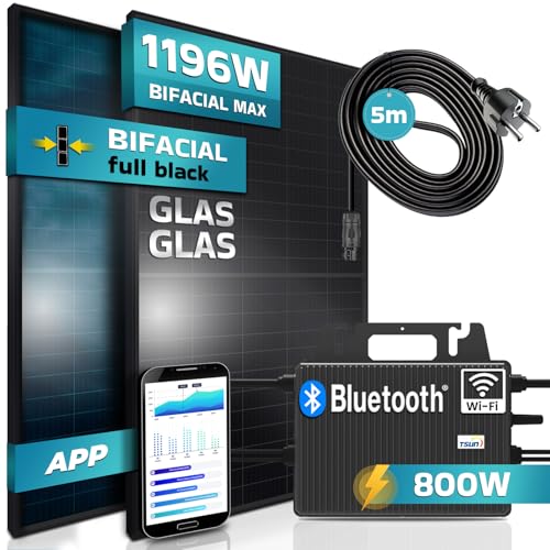 Dank der Bifazial-Technologie der 2x 460W Full Black Glas/Glas Solarmodule erzielst du selbst bei schwachen Lichtverhältnissen hohe Erträge. Du kannst eine Ausgangsleistung von 600 bis 800 Watt einstellen, was dir ermöglicht, jährlich bis zu 360,- EUR an Stromkosten zu sparen. Diese Ersparnis basiert auf einer Leistung von 880 kWh pro Jahr und einem Arbeitspreis von 40 Cent je kWh.