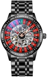 Die MASTOP Roulette Rad Herren Uhr ist eine beeindruckende automatische mechanische Uhr, die mit ihrem einzigartigen Roulette-Rad-Design besticht. Das Zifferblatt zeigt rote und schwarze Sektoren sowie grüne Zahlen und bietet mit seiner ausgehöhlten Mitte ein faszinierendes visuelles Erlebnis. Durch einen leichten Schwung des Handgelenks dreht sich das digitale Roulette und stoppt, wenn das Handgelenk stillsteht. Diese Interaktivität macht das Tragen der Uhr zu einem besonderen Erlebnis, während die personalisierte Leuchtanzeige auch in dunklen Umgebungen eine schnelle Zeiterkennung ermöglicht.