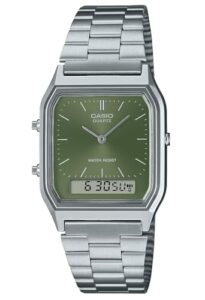 Die Casio Watch AQ-230A-3AMQYES vereint klassische Analog-Digital-Technologie in einem ansprechenden Design. Das Zifferblatt mit Sonnenschliff in Schwarz wird von einem robusten, silbernen Edelstahlband mit einer Länge von 20 cm und einer Breite von 20 mm ergänzt. Die Klappschließe sorgt für einen sicheren Halt am Handgelenk.