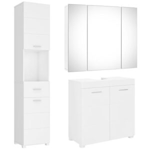 Die Schränke sind aus lackierten MDF-Platten gefertigt, die für Stabilität und Langlebigkeit sorgen. Die glatte, pflegeleichte Oberfläche erleichtert die Reinigung und Pflege der Möbel. Im Lieferumfang sind der Spiegelschrank mit drei Türen, der schmale Hochschrank sowie der Waschbeckenunterschrank enthalten. Eine Aufbauanleitung und das benötigte Montagematerial sind ebenfalls im Paket enthalten.