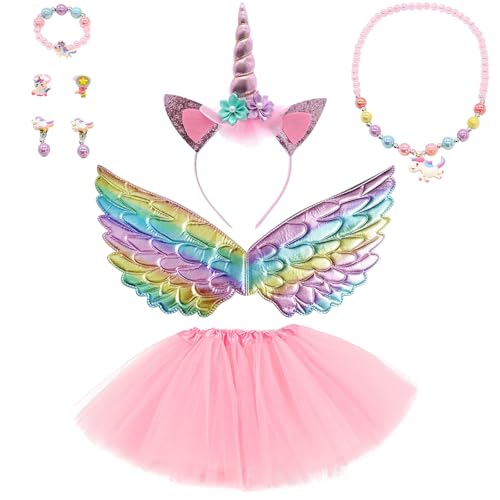 Entdecke das HTTDSLF Einhorn Kostüm Prinzessin Set, das aus 9 liebevoll gestalteten Teilen besteht. Dieses komplette Kostümset enthält einen flauschigen Tutu-Rock, zauberhafte Flügel, ein Einhorn-Stirnband, eine Halskette, ein Armband, Ringe und Ohrclips. Perfekt für kleine Mädchen im Alter von 2 bis 7 Jahren, bietet es alles, was du für ein gelungenes Cosplay benötigst.