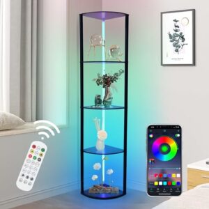 Dieses 5-stufige RGB Eckregal ist eine durchdachte Kombination aus einer eleganten Stehlampe und einem praktischen Regal aus Holz. Ausgestattet mit einer RGB-LED-Lichtleiste schafft es eine angenehme Atmosphäre in Ihrem Wohnraum. Das Glasrohr reduziert Blendung und verbessert die Gesamtästhetik, während der Eckrahmen eine effiziente Nutzung des Eckenraums ermöglicht. Damit bleibt Ihr Zuhause ordentlich und stilvoll.