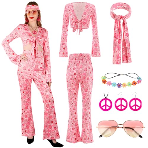 Entdecke das Gigquake Hippie Kostüm Damen Set, das ideale Outfit für deine nächste Mottoparty oder Faschingsveranstaltung. Dieses Set umfasst eine 70er Jahre Glockenbodenhose, eine Blumenkronenhippie, ein Hippie Stirnband, eine Friedenszeichen Halskette, Ohrringe aus den 70ern und eine Hippie Sonnenbrille. Mit diesem Kostüm wirst du garantiert alle Blicke auf dich ziehen!