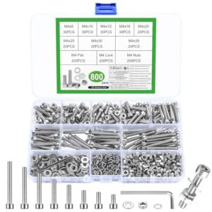 Der Lieferumfang umfasst 800 Stück in verschiedenen Größen: M4 x 8 mm, 10 mm, 12 mm, 16 mm, 20 mm, 25 mm, 30 mm und 35 mm, einschließlich M4-Unterlegscheiben, M4-Sicherungsscheiben und M4-Sechskantmuttern. Dieses Set erfüllt alle Anforderungen, die Sie an qualitativ hochwertige Befestigungselemente stellen.