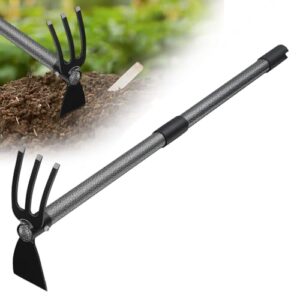 Die Gartenhacke mit einer Länge von 114 cm ist das ideale Werkzeug für vielfältige Gartenarbeiten. Ob Sie Unkraut jäten, den Boden lockern oder Löcher für Pflanzen graben, dieses leichte und multifunktionale Gartenwerkzeug unterstützt Sie effizient. Die 2-in-1 Funktion ermöglicht ein einfaches Umklappen des Griffs, sodass Sie das Gartenhackenmesser zum Ausgraben von Schmutz oder Zerkleinern von Unkrautwurzeln nutzen können. Die 3 Stahlzinken sind perfekt zum Aufwirbeln des Schmutzes und Unkrautjäten in kleineren Blumenbeeten.