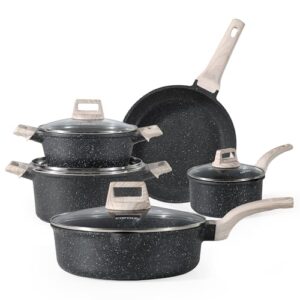 Entdecken Sie das CAROTE Topfset Pfannenset 9-teilig, das Ihnen alles bietet, was Sie für Ihre täglichen Kochbedürfnisse benötigen. Dieses umfassende Set beinhaltet eine hochwertige Pfanne mit einem Durchmesser von 24 cm, eine Stielkasserolle mit Deckel (18 cm), zwei Kochtöpfe mit Deckeln (20 cm und 24 cm) sowie eine tiefe Bratpfanne mit Deckel (28 cm). Jedes Stück ist mit einer umweltfreundlichen Antihaft-Graniteffekt-Beschichtung ausgestattet, die eine zehnfache Ultra-Antihaft-Leistung bietet und frei von PFOS/PFOA ist, wodurch Ihr Kochen sicherer und gesünder wird.