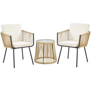 - Hochwertiges Rattangeflecht: Die Rücken- und Armlehnen der Stühle sowie die Seiten des Tisches sind aus robustem und dicht gewebtem Rattan gefertigt. Dies sorgt nicht nur für eine hohe Haltbarkeit, sondern verleiht auch einen natürlichen Charme.