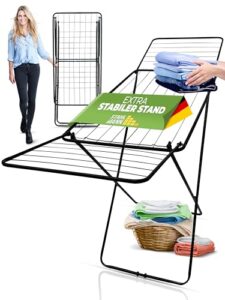 Der STAHLMANN ® Wäscheständer in elegantem Schwarz bietet Ihnen eine großzügige Trockenfläche von bis zu 18 m, ideal zum gleichzeitigen Trocknen von Kleidung, Bettwäsche und Handtüchern. Mit diesem praktischen Wäscheständer sparen Sie Zeit und Mühe, da Sie alles auf einmal aufhängen können, ohne mehrere Ladungen vorzunehmen.